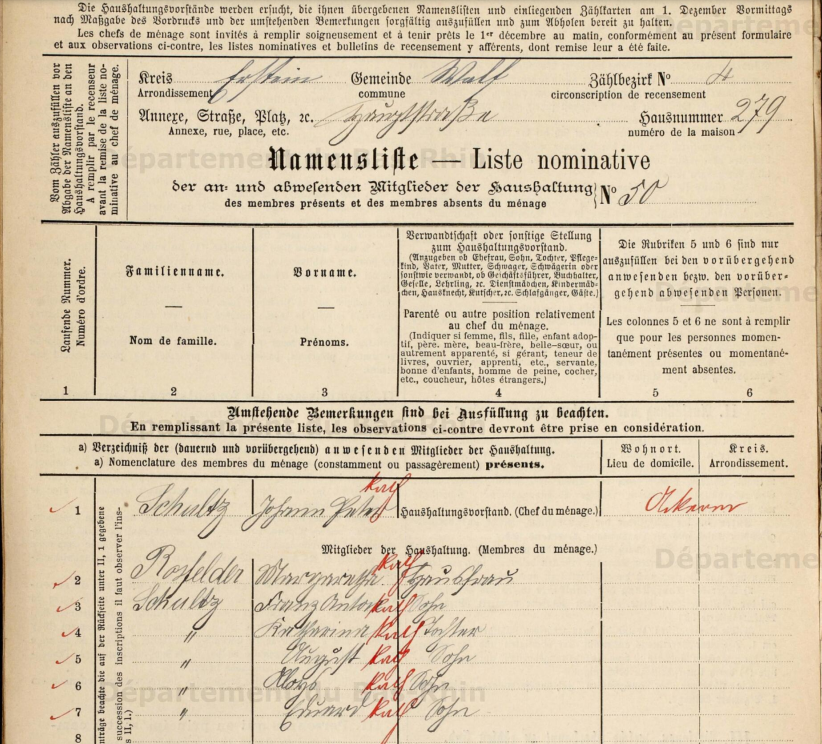 En 1901, Auguste avait épousé Madeleine HAAS, originaire de Bindernheim. Le couple s'installa d'abord à Bindernheim, puis déménagea à Erstein, où Auguste dénicha un emploi à l'usine de filature. Le couple aura deux garçons et trois filles, tous nés à Erstein. Quel a été leur vie ? Cela reste un mystère. Le suicide d'Auguste SCHULTZ laissera une femme et des enfants avec un profond sentiment d'abandon. Les enfants seront les victimes.