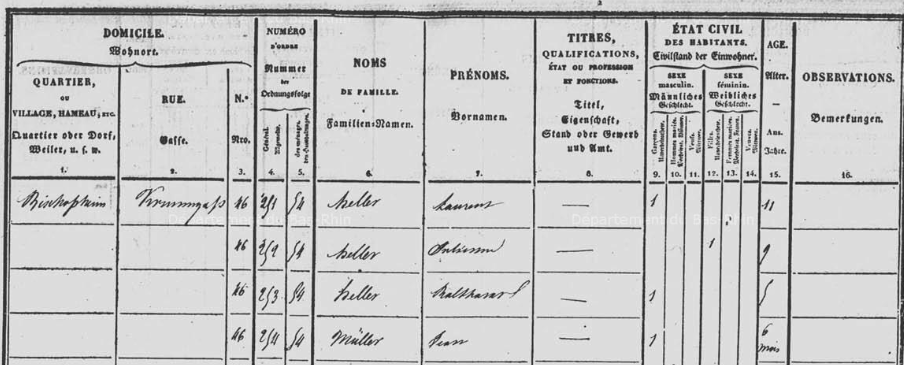 Recensement de 1836. Julienne, la mère, son deuxième mari, Valentin MULLER, leur fils, Jean, Valentin HELLER, Laurent, Julienne et Balthazar habitent au n°65 de la rue dit Krummgass (angle de la rue Épiscopale et de la Rue Principale à Bischoffsheim). En 1846, elle recevra le n°46