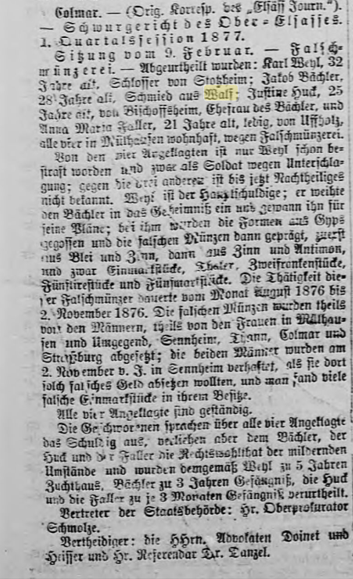 Compte-rendu du procès à Colmar des accusés de fabrication de fausse monnaie dont Jacques BAECHLER de Valff du 11 février 1877