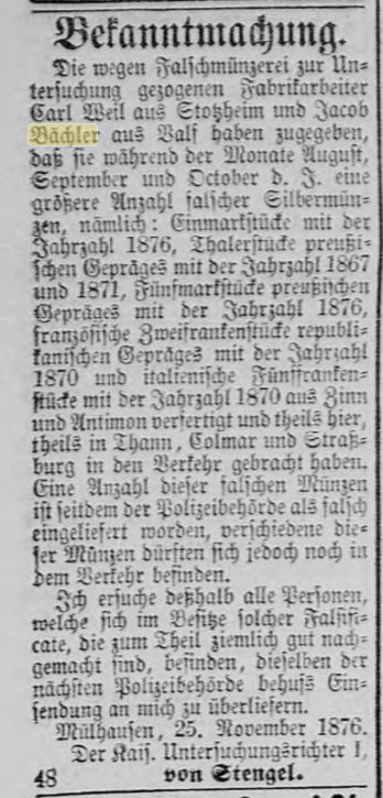 Annonce concernant l'implication de Charles WEIL de Stotzheim et de Jacques BAECHLER de Valff dans un trafic de fausse monnaie le 3 décembre 1876
