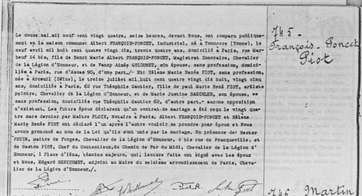 Hélène Marie-Renée, née le 13 juillet 1898 à Arcueil Cachan, légitimée lors du mariage des parents, décédée le 16 novembre 1960, épouse d'Albert FRANÇOIS-PONCET, industriel, docteur en droit et aviateur. Docteur en droit, industriel depuis 1918, vice-président (1956-1971), puis administrateur et vice-président d'honneur (depuis 1972) des entreprises J.-J. Carnaud et Forges de Basse-Indre, entre-autres fabrications, des boites de conserves. Le couple habitait au 23 avenue Charles Floquet, 7e arrondissement à Paris.