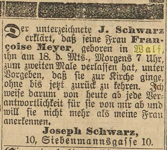 « Je, sous-signé, J. SCHWARTZ, habitant au 10, Siebenmannsgasse (rue des sept-hommes, quartier gare à Strasbourg), déclare que ma femme, Françoise MEYER, née à Valff, s'est barrée de la maison à sept heures du matin, et cela, pour la deuxième fois, avec l'excuse d'aller à l'église. À ce jour, elle n'est pas réapparue. Je communique donc à tous, et fait savoir, qu'à partir de ce jour, je ne la considère plus comme ma femme et décline toute responsabilité la concernant ! » Voilà, c'est dit ! Love is in the air ! ♫ ♪ ♫