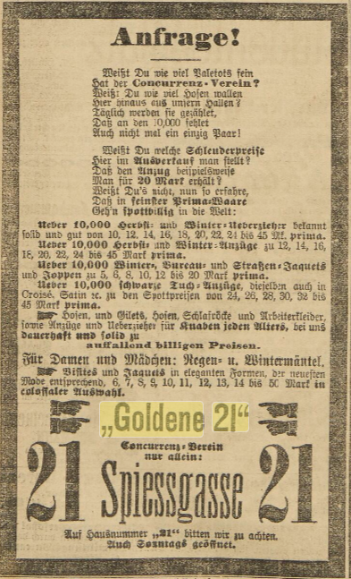 Le magasin d'habillement s'appelait Die GOLDENE 21 et se trouvait au 21 de la rue Spiessgasse. Il s'agit de la rue des Hallebardes.