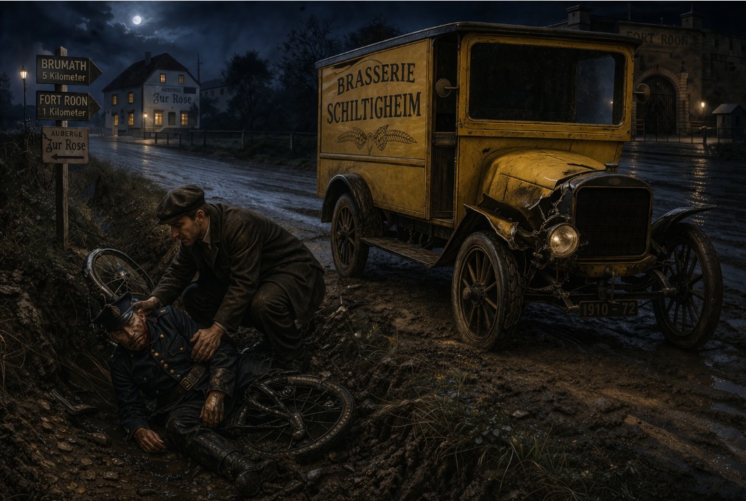 Voici une histoire qui aurait fait la une d'Info Trafic Bas-Rhin s'il avait existé en 1910. Les faits : en marge de la course automobile du prince Henri (le frère de l'Empereur) qui fait étape ce jour-là à Strasbourg, le beau-frère de Paul Daimler, fils du co-inventeur du moteur à explosion (Daimler Mercedes), le lieutenant Wilhelm Jacob, 21 ans, militaire au 132ᵉ d'infanterie au fort Roon (fort Desaix), entre en collision avec sa motocyclette, peu après minuit, avec un engin décrit par le vigile du fort comme étant de couleur jaune, sur la rue de Brumath, près de l'auberge « Zur Rose ».