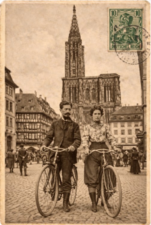 22 août 1898. Lui, moustache à la Buffalo Bill, elle, belle et distinguée dans son habit « sport », le couple Harold DARWIN et Hattie McILRATH, des vélocypédistes « globetrotters », a fait escale à Strasbourg.