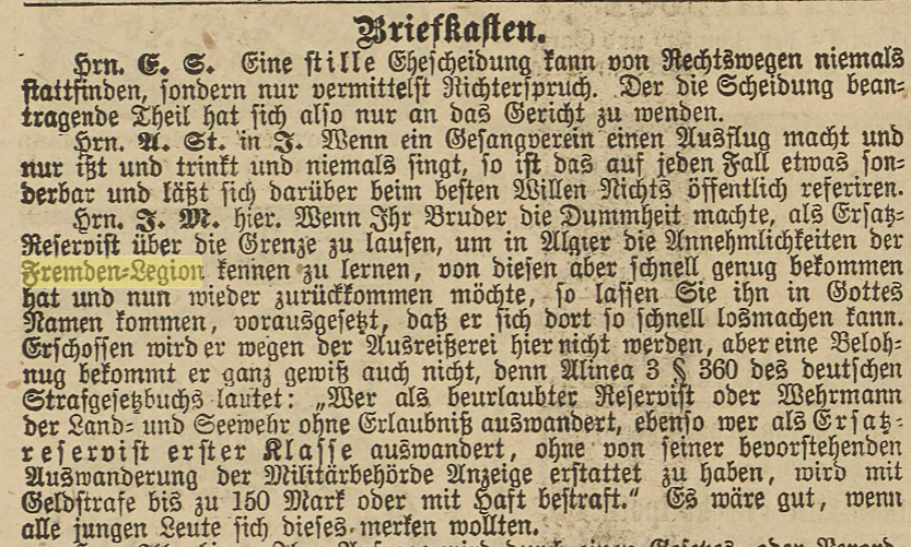Un article paru dans le courrier des lecteurs du journal Neueste Nachricht General-Anzeiger für Elsass-Lothringen du 7 août 1886, imprima la réponse du journal à l'attention d'un lecteur : « Monsieur J. M. Si votre frère a commis la folie, en tant que réserviste de remplacement, de franchir la frontière pour aller à Alger afin d’y découvrir les agréments de la Légion étrangère, mais qu’il en a eu assez rapidement et souhaite maintenant revenir, alors laissez-le revenir au nom de Dieu, à condition qu’il puisse s’en libérer là-bas assez vite.