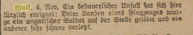 Quoi qu'il en soit, en novembre 1918 alors que la guerre touchait à sa fin, un pilote d'aéroplane allemand stationné à Stotzheim, voulant atterrir sur la Hagelmatt pour un rendez-vous galant avec la fille du receveur fiscal de Valff, écrasa fissa deux soldats hongrois qui participaient à une manœuvre. Le premier fut tué, le deuxième grièvement blessé. Il reprit promptement les airs pour ne pas se faire lyncher par les copains hongrois furax ! L'amour donne des ailes, il parait... 🦋