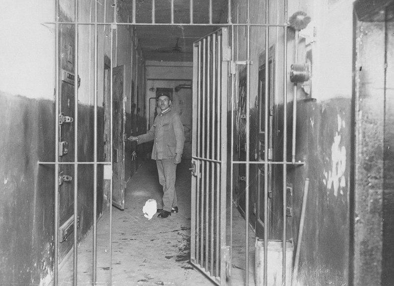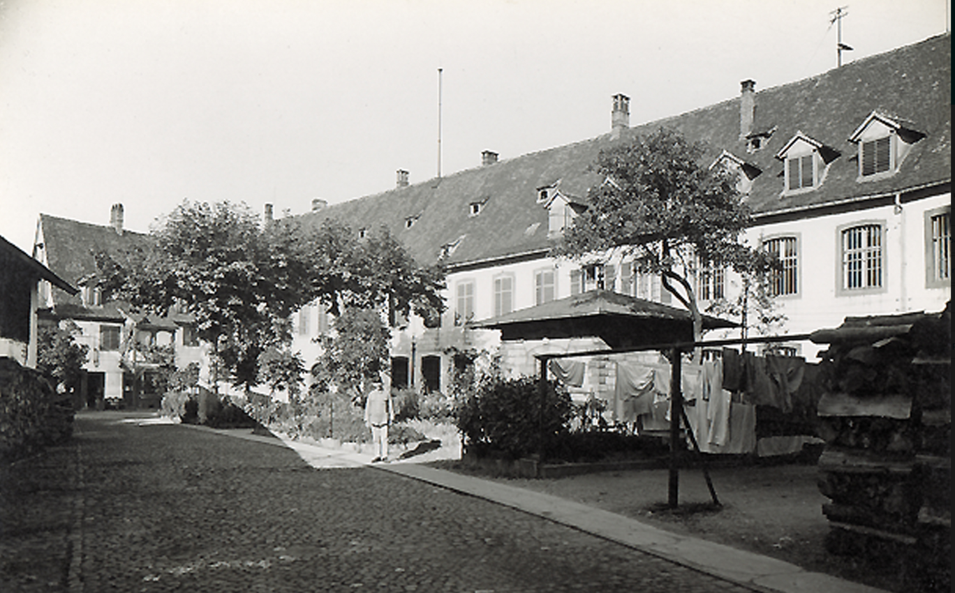 Le rapport est relevé dans le Strasburger Neuesten Nachrichten du 17 juin 1914. En pénétrant dans la première cour de la prison de district - qui, soit dit en passant, dégage une impression plutôt agréable grâce à ses aménagements paysagers - on atteint, après une centaine de pas, une lourde porte en fer située à l’arrière des bâtiments. Elle interdit l’accès à une cour intérieure de moins de cent mètres carrés, appelée la cour d’attente (knabenhof), autrefois utilisée pour la promenade des jeunes détenus. Entouré de bâtiments, cet espace est clos côté rivière par un mur de cinq mètres de haut.