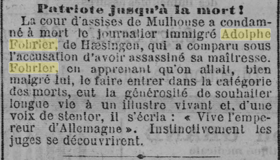 Une femme d'Altkirch a reçu la nouvelle que son mari, engagé dans la légion étrangère, sera fusillé le jour même; Il a été condamné à mort pour tentative d'assassinat sur un gradé. Déjà sous le drapeau prussien, il avait écopé de deux ans de forteresse pour insubordination à un officier. Marié, il a fuit le domicile conjugal et s'est engagé dans la Légion pour cause d'incompatibilité avec son épouse de 30 ans son aînée ainsi que des ennuis divers avec les autorités.