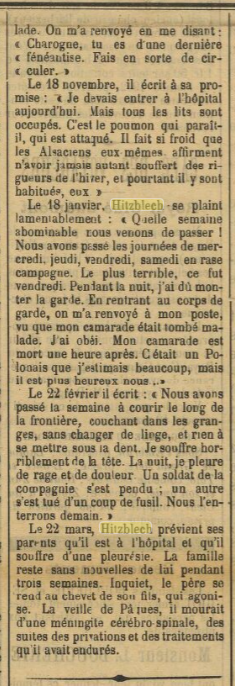 Le 18 janvier, HITZBLECH se plaint lamentablement : « Quelle semaine abominable nous venons de passer ! Nous avons passé les journées de mercredi, jeudi, vendredi, samedi en rase campagne. Le plus terrible, ce fut vendredi. Pendant la nuit, j'ai dû monter la garde. En rentrant au corps de garde, on m'a renvoyé à mon poste, vu que mon camarade était tombé malade. J'ai obéi. Mon camarade est mort une heure après. C'était un Polonais que j'estimais beaucoup, mais il est plus heureux [que] nous ».