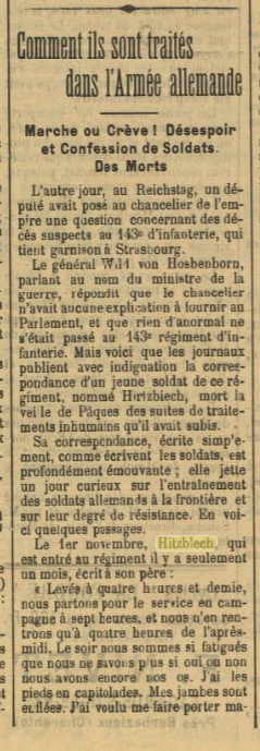 Ce texte sera reproduit intégralement par presque tous les journaux français : « L'autre jour, au Reichstag, un député avait posé au chancelier de l'Empire une question concernant des décès suspects au 143ᵉ d'infanterie (1), qui tient garnison à Strasbourg. Le Général Wild von HOHENBORN, parlant au nom du ministre de la Guerre, répondit que le chancelier n'avait aucune explication à fournir au Parlement, et que rien d'anormal ne s'était passé au 143ᵉ régiment d'infanterie. Mais voici que les journaux publient avec indignation la correspondance d'un jeune soldat de ce régiment, nommé HITZBLECH, mort la veille de Pâques des suites de traitements inhumains qu'il avait subis.