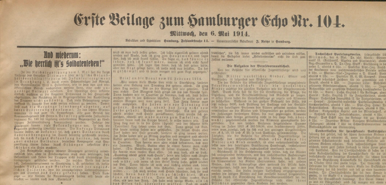 Le journal Hamburger Echo titrait : « Et encore une fois : "Quelle est belle la vie militaire !" ».