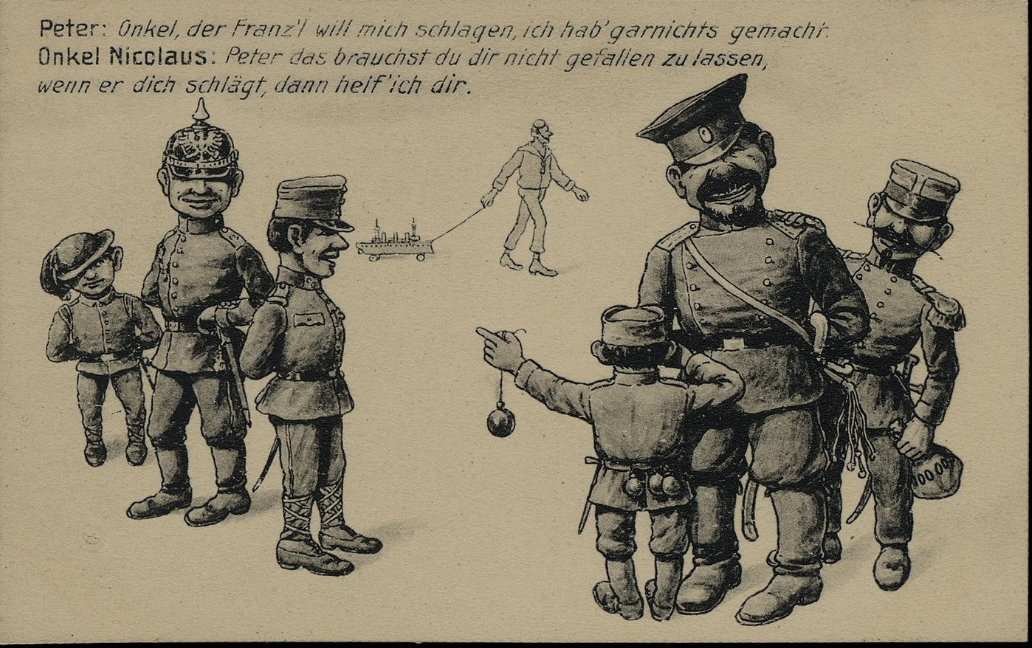 Propagante : Peter (royaume de Serbie) : « Oncle Franz (Autriche-Hongrie), il veut me taper, je n'ai même rien fait » - Oncle Nicolas (Tzar de Russie) : « Ne te laisse pas faire, s'il veux te taper, je t'aiderai ». Derrière Franz'l (casque à pointe, l'Allemagne) et à gauche l'Italie