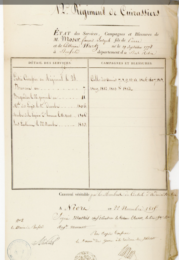État de services de Moser François Joseph, chevalier de la Légion d'honneur