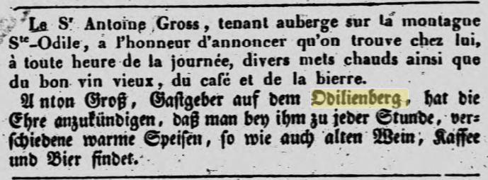 Cette dernière se trouve non loin du domaine de Niedermünster, situé au pied de la montagne, qui appartenait jusqu'alors à la famille TAUFLIEB de Barr (dont l'ancêtre juif de Valff se converti au catholicisme en 1781, en savoir plus : La saga de la famille TAUFFLIEB) et qui a été cédé l'année dernière à l'évêché de Strasbourg. Par conséquent, l'auberge qui s'y trouve cessera d'exister à la fin du bail actuel. Cette halte était bien connue de tous les visiteurs des Vosges.