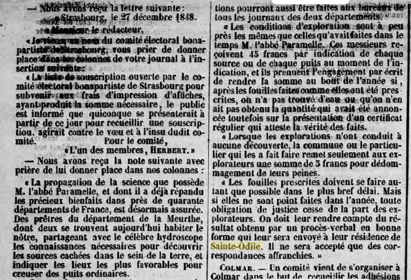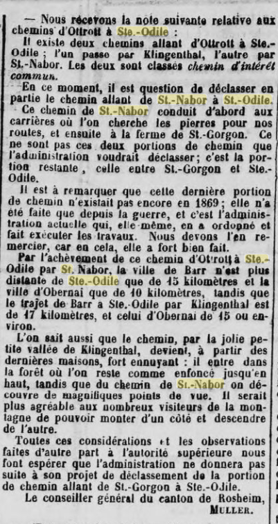 25 mai 1899, concernant les projets d'infrastructures en Alsace. La construction et le nouvel aménagement d'une route carrossable reliant Hohwald au Mont Sainte-Odile (Odilienberg), ainsi que d'une autre route partant de Barr, traversant la vallée de Barr via le Maennelstein pour rejoindre la route susmentionnée, débuteront encore cette année. Les travaux doivent être menés de manière à ce que les deux liaisons vers le Mont Sainte-Odile puissent être mises en service dès l'année prochaine. Grâce à ces deux nouvelles routes, la circulation dans cette belle partie des Vosges sera grandement favorisée et l'exploitation de vastes zones forestières sera considérablement facilitée. La route Hohwald-Mont Sainte-Odile aura une longueur de 9,8 km ; celle partant de Barr par le Maennelstein, se raccordant à la route précitée depuis la place du bois (Holzplatz), sera nouvellement aménagée sur 5,60 km. À l'avenir, la longueur de la route carrossable entre la gare de Barr et le Mont Sainte-Odile sera d'un peu plus de 10 km.