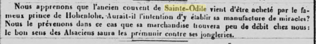 Le « fameux » prince mentionné ici est très certainement Alexandre de HOHENLOHE (1794-1849). Prêtre et futur évêque, il était célèbre dans toute l'Europe des années 1820 pour ses prétendues guérisons miraculeuses par la prière à distance. C'est à cela que l'article fait référence en parlant ironiquement de sa « manufacture de miracles ». Cet achat reste une rumeur.