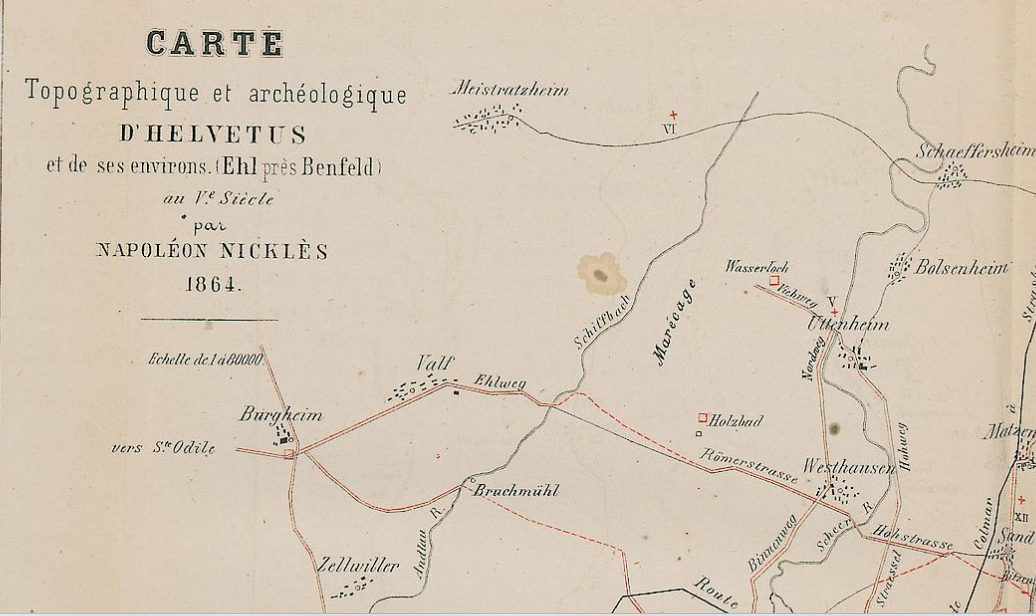 Plan de 1864 des voies gallo-romaines par Napoléon NICKLES (notez le terme Ehlweg - Ehl huile, Weg - chemin passant au Sud de Valff, encore connu par les anciens par d'Ehlstons)