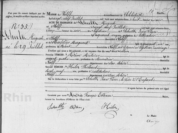 En 1901, Auguste avait épousé Madeleine HAAS, originaire de Bindernheim. Le couple s'installa d'abord à Bindernheim, puis déménagea à Erstein, où Auguste dénicha un emploi à l'usine de filature. Le couple aura deux garçons et trois filles, tous nés à Erstein. Quel a été leur vie ? Cela reste un mystère. Le suicide d'Auguste SCHULTZ laissera une femme et des enfants avec un profond sentiment d'abandon. Les enfants seront les victimes.