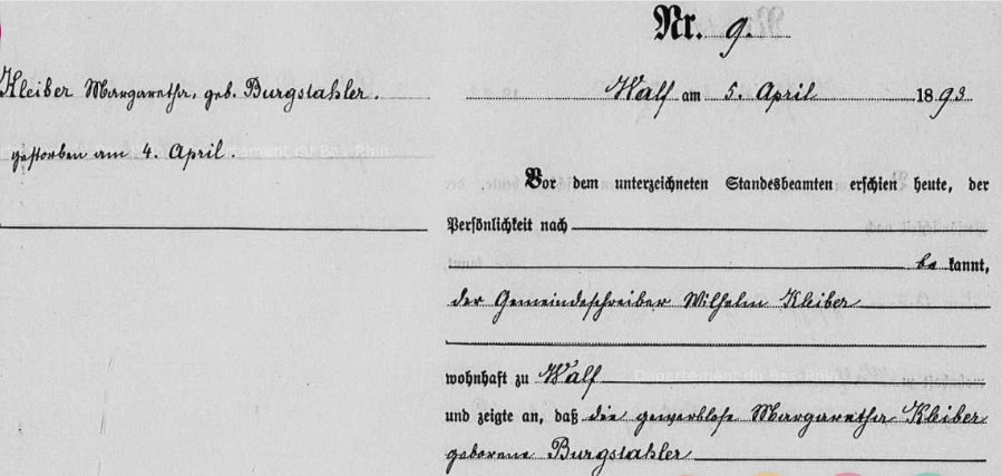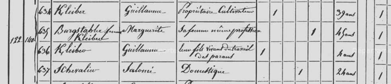 Caspar Guillaume KLEIBER, épouse Marguerite BURGSTAHLER. Il enterra, le 24 juin 1847, son fils de 21 mois, puis 20 jours plus tard aussi sa fille Marguerite âgée de 20 ans et demi. Il décéda à l'âge de 40 ans le 25 juin 1852. Le métier d'agriculteur et boulanger semble être une vocation familiale car son père Antoine, et son frère, Georges, partagent l'activité. Peut-être que la vocation de boulanger est à chercher du côté de sa mère, Anne Marie WILLMAN, la fille de Jean Jacques WILLMAN, l'ancien boulanger au four banal de Valff. Comme du bon pain ...