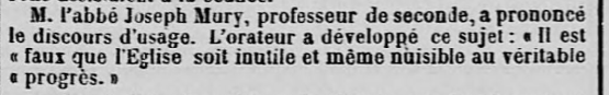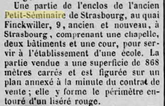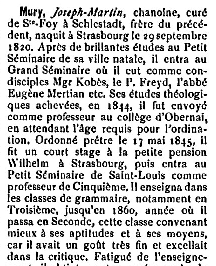 Lors de la distribution des prix annuelle au Petit-Séminaire (dévoilée en 1861 dans le Niederreinische Kurier), il est question d'un abbé Joseph MURY, professeur de seconde, et d'un abbé WOLFF qui fut l'un des orateurs lors de cette promotion 1863. Tous deux ont été professeurs au Petit-Séminaire de St-Louis, 6 place St-Louis. Le supérieur était l'abbé Reich. En 1868, l'établissement accueillait 450 élèves dont 50 externes. À l'emplacement actuel est construite aujourd'hui une maison de retraite, Les jardins d'Arcadie. https://jardins-arcadie.fr/residence/residence-seniors-strasbourg?residence_interet=87