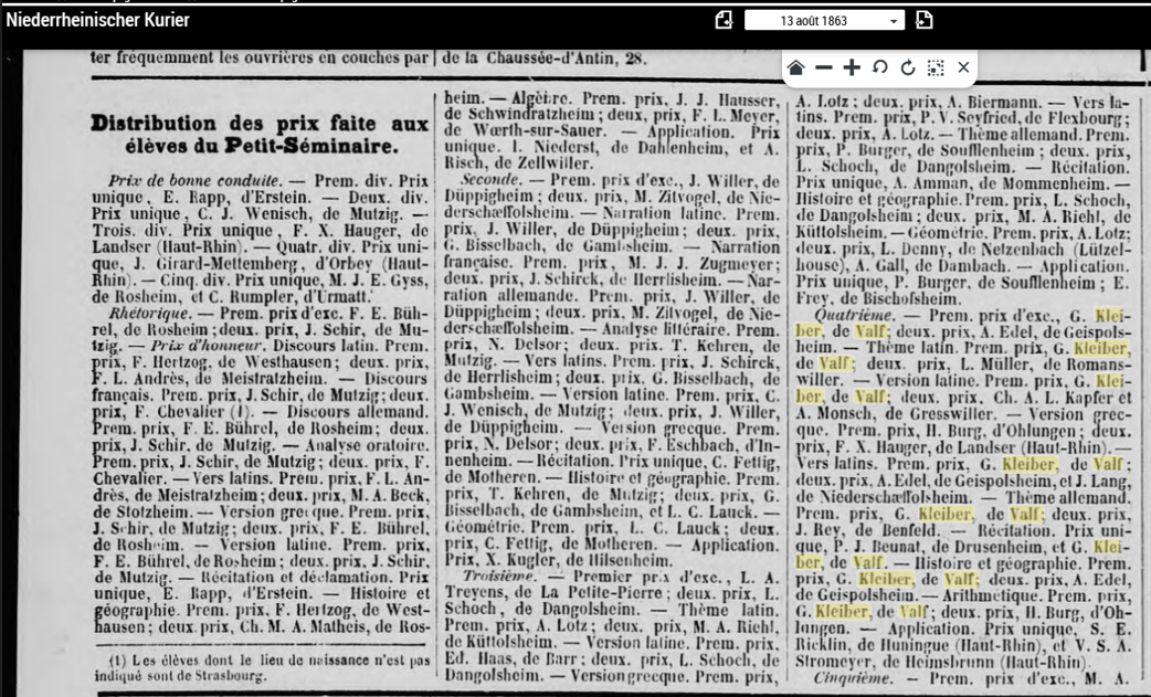 1863, distinctions de Guillaume KLEIBER, 16 ans à l'époque, élève en classe de quatrième :