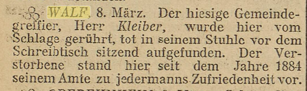 « Walf, le secrétaire de mairie, M. KLEIBER, a été victime d'un arrêt du cœur. Il a été retrouvé assis sur sa chaise devant son secrétaire. Le défunt avait servi l'administration communale depuis l'année 1884 », lira-t-on dans un journal.