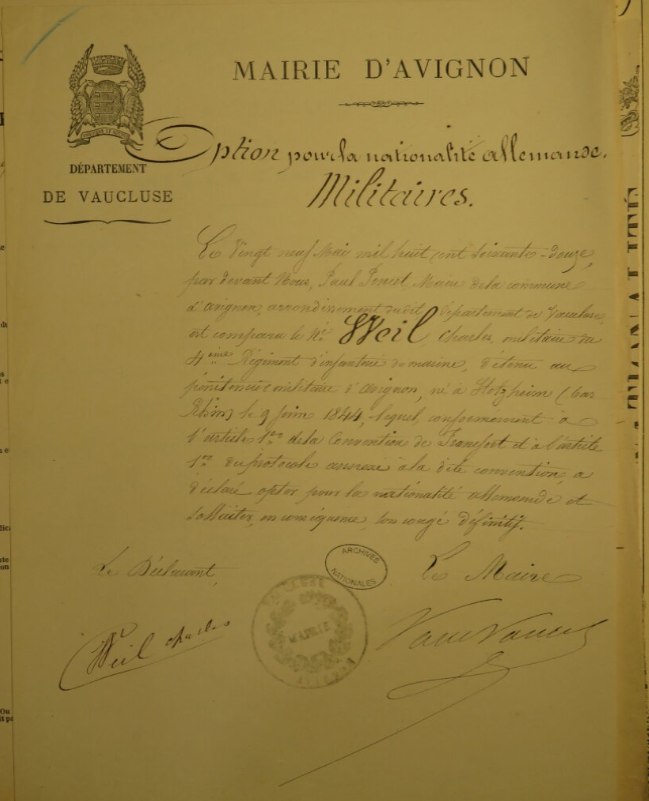 Avons-nous la possibilité d'en savoir un peu plus, 150 ans plus tard ? Commençons par Charles WEIL de Stotzheim. Nous n'avons que peu d'éléments à son sujet, à part cet acte de 1872 qui nous apprend que pendant son service militaire à Avignon, il a eu des démêlés avec la justice où il a goûté à la bonne pitance du pénitencier militaire de cette ville. Comme tous les alsaciens lorrains d'après 1871, il pouvait choisir sa future nationalité. Pour lui, elle restera allemande (parce que la pitance au pénitencier français est nulle, peut-être !) 🥶). Né en 1844, il avait donc 32 ans en 1876, année qui nous intéresse.