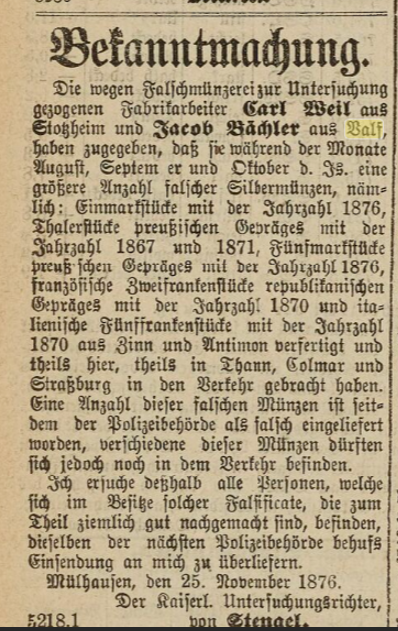L'ouvrier d'usine Charles WEIL de Stotzheim et Jacques BÄCHLER de Valff ont reconnu que, durant les mois d'août, septembre et octobre de cette année, ils ont fabriqué et distribué une quantité de pièces de monnaie en argent, c'est-à-dire des pièces d'un Mark avec l'impression 1876, des pièces de Thaler prussiens des années 1867 et 1871, des pièces de 5 Marks prussiens avec l'année 1876, des pièces françaises de 2 francs avec le marquage République 1870, et des pièces de cinq francs italiens (Italienische Fünffrankenstücke) de l'année 1870 en étain et en antimoine. Ils reconnaissent également les avoir distribuées dans les villes de Thann, Colmar et Strasbourg. Une certaine quantité de ces fausses pièces a été rapportée aux services de police, mais une quantité non identifiée pourrait encore se trouver en circulation.