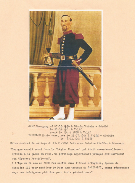 Jacques BAECHLER. Né le 7 juillet 1813 à Meistratzheim, il exerçait le métier de tisserand. Son père Jacques, tisserand également et gardien de nuit à Meistratzheim, avait épousé Sophie GOETTELMANN. Le couple engendrera une sœur à Jacques, prénommée Sophie. Le Jacques qui nous concerne, épousera une fille de Valff, de père tisserand : Marie-Françoise HEISSLER. La famille s'agrandit avec Marie-Anne, Françoise, Joseph, Thérèse, Louise et Catherine.