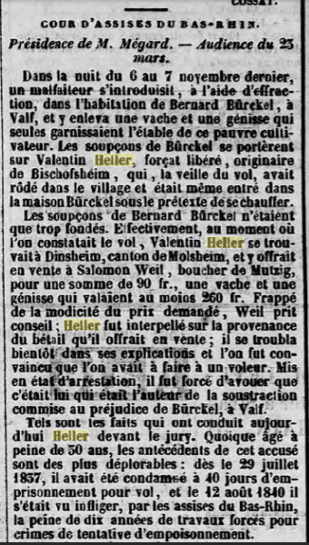 1842. Pourquoi le jeune Valentin HELLER sombra-t-il dans la délinquance ? Le contexte est propice. Le jugement de la session de la cour d'assises du Bas-Rhin du 12 août, nous livre quelques pistes. Valentin est l'aîné d'une famille d'orphelins. Le père s'appelait Jean, il était boucher. Il décède en 1831. Son épouse, Julienne WANTZ, se remarie avec le vigneron Muller Valentin en février 1835. Ils s'installent dans la maison et Julienne met au monde un fils en décembre, prénommé Jean. Julienne WANTZ décède brusquement et curieusement l'année suivante en 1836 !