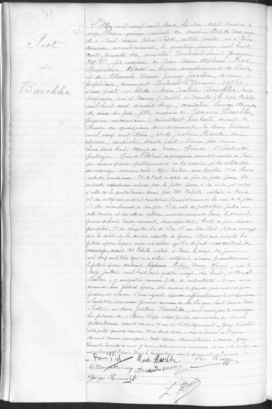 Dans l'acte de mariage de Paul Marie René PIOT et de Marie Justine BAECHLER du 17 mars 1903, on note qu'il est sans profession, domiciliée avec son père au 11 passage Alexandre à Paris. Justine HÜCK est déclarée empêchée. Témoins : Henri RUPP, artiste peintre, administrateur de musée, George DESVALIERE, artiste-peintre, Georges Rouault, conservateur de musée Gustave Moreau.