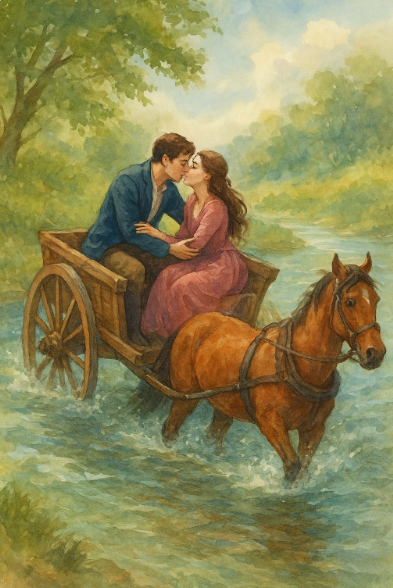 Sur la charrette trônait un jeune couple d’amoureux insensibles, ni au climat, ni au charme du paysage, n'ayant d'yeux que l'un pour l'autre. Ils devaient bientôt être unis par les liens les plus doux d’Hyménée, et étaient plongés dans la plus tendre des conversations. Soudain, les roues de la charrette, qui s’était approchée trop près du ruisseau de la Kirneck, s’enfoncèrent dans la rive molle ; toute la charge se renversa, et les adeptes de Maître Amour se retrouvèrent projetés dans la rivière. Ce bain involontaire ne dura que quelques secondes, mais l’humidité n’eut pas le temps de pénétrer jusqu’au cœur de nos amoureux intrépides pour le refroidir, et c’est très bien ainsi.