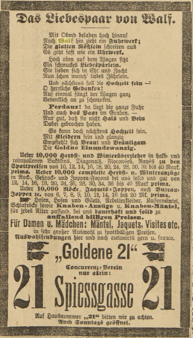 Le magasin d'habillement s'appelait Die GOLDENE 21 et se trouvait au 21 de la rue Spiessgasse. Il s'agit de la rue des Hallebardes.