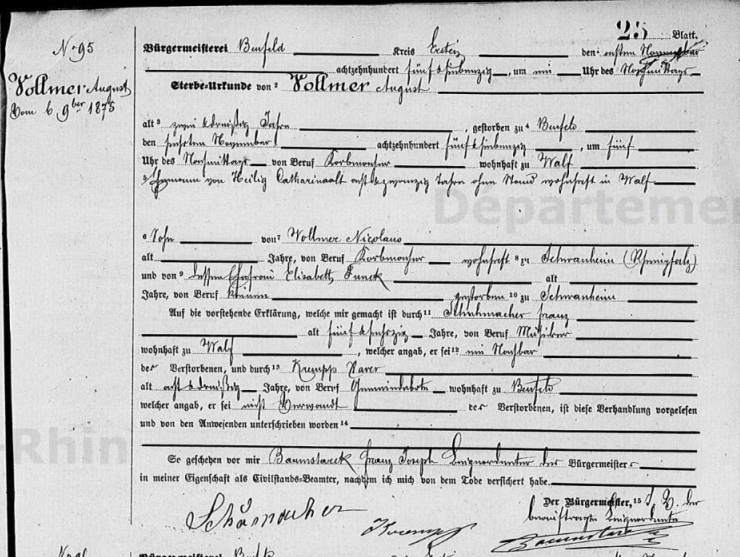 Acte de décès de VOLLMER Nicolas, 32 ans, époux de HEILIG Catherine, sur la déclaration du musicien SCHUHMACHER François, voisin, domicilié à Valff