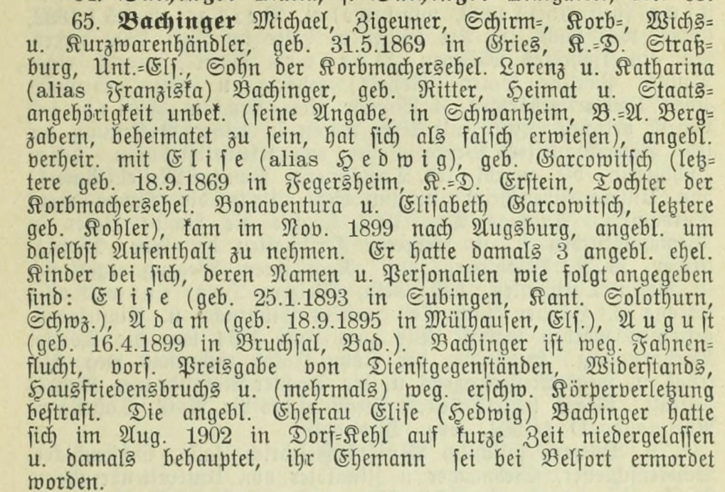 Il se dit s'appeler Michel, né à Gries en 1869. Il s'appelle aussi BACHINGER. Il est vannier, marchand et réparateur de parapluie et de cire à chaussures et merceries en tout genre. Pendant la Première guerre, il fut recherché pour désertion. Il dit que son père est originaire de Schwanheim, comme notre Jacques cité plus haut. Il est soi-disant marié à Elise GARCOWITSCH de Fegersheim. Michel a été vu à Augsbourg avec sa femme et ses trois enfants, Elise, Adam et Auguste, nés un peu partout dans le pays. Il est connu pour petits délits divers comme la contrebande ou vol avec violence. Elise, son épouse, s'était installée un temps à Kehl où elle a affirmé à la police qui le recherchait pour l'enrôler, que son mari avait été assassiné à Belfort.