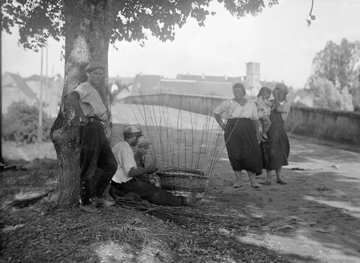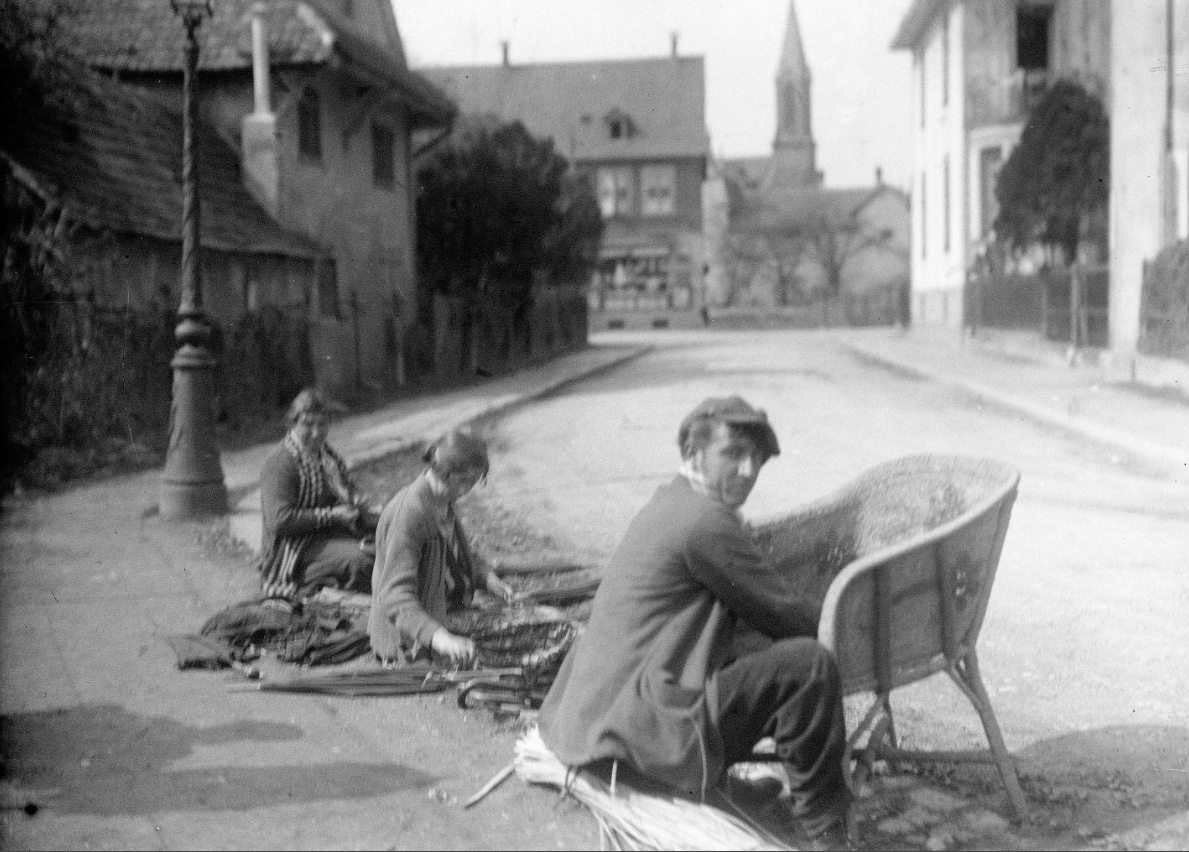 Famille de vanniers à la Robertsau vers 1930. Les femmes réparant des parapluies. Fond BLUMER, archives de Strasbourg