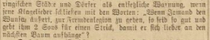 Voici quelques extraits d'un éditorial paru déjà en octobre 1886 dans le même journal : « Je pense ici notamment à la situation terrible où des frères lèvent les armes les uns contre les autres, et combien la situation pourrait devenir difficile si un conflit franco-allemand devait éclater brusquement ? Alors, je demande : qui porte véritablement la faute dans la plupart de ces cas ? Ne sont-ce pas ceux qui veulent servir dans l'armée française et surtout éviter les garnisons, des haïs sans raison, ces"Schwowe" ? [..] Que dire de ceux qui tournent le dos au pays où ils ont reçu la finesse et la galanterie, le pays qui parle la même langue maternelle, la voix du sang, rejoignent ceux qui méprisent, ceux qui les appellent "ces stupides Alsaciens" ? " Ils atterrissent dans la Légion étrangère, sous des climats insoutenables, des marécages nauséabonds du Tonkin, entourés de hordes d'incivilisées et sous les bravadent de supérieurs qui les considèrent, comme le nom de leur unité l'indique :" des étrangers" ».