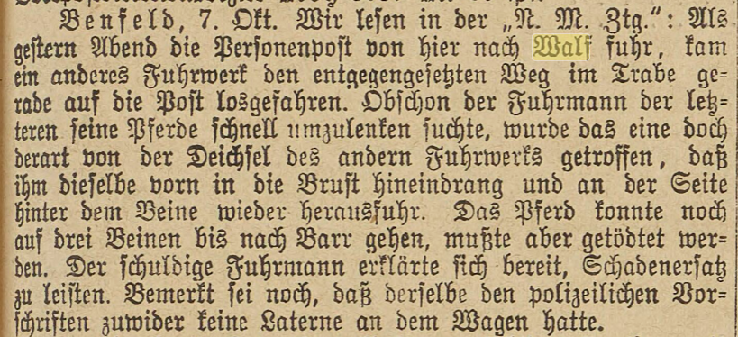 Fait divers du 7 octobre 1885, accident de calèches. Durant son service de poste et de transport de passagers, la diligence WINGERT, revenant de Benfeld vers Valff, s'accrocha avec un attelage mené au trot, d'en face. Un des deux chevaux de la diligence eut la poitrine et le côté perforés par l'essieu du chauffard. L'animal a dû être abattu à son retour à Barr. Le propriétaire de l'attelage incriminé propose des dédommagements. Néanmoins, une enquête de gendarmerie est ouverte, l'attelage n'était pas équipé de lanterne.