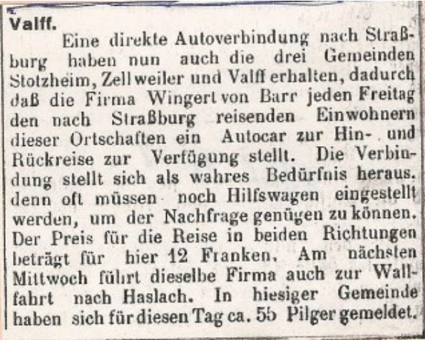 1928. Article informant que l'autocariste WINGERT met à disposition un passage tous les vendredis pour un aller-retour pour Strasbourg via Stotzheim, Zellwiller et Valff. Le prix est établi à 12 francs. À la suite de l'influence grandissante, le nombre de bus est doublé. Des ramassages touristiques pour des lieux de culte comme HASLACH sont également programmés. Il y a 55 inscrits pour Valff.