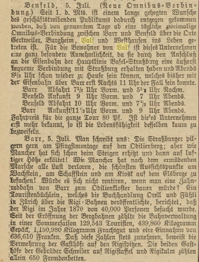 En 1886, nouveaux horaires de « l'omnibus » à cheval. Avec un nombre croissant de visiteurs à pied au Sainte-Odile, le journal Neueste Nachrichten pose la question : « Et pourquoi on ne construirait pas un train à crémaillère de Barr au Ste-Odile comme à Zurich ? ». Comme quoi, le projet d'un nouveau mode de transport vers le mont qui sommeille depuis quelques années n'est pas nouveau. Pour information : le premier véhicule automobile à moteur à s'époumoner à gravir les pentes du mont Sainte-Odile s'est illustré en 1897 !