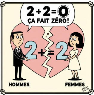 Pour tout vous avouer, mon épouse, quelque peu remontée, a fait cette remarque censée : « Comme les femmes de l'époque n'avaient rien à dire, ce sont des hommes écervelés qui ont inventé ces citations minables et machistes ! ». Qu'en pensez-vous, Sacha GUITRY qui a écrit : « Le monde se divise en deux : les femmes et les hommes. Et ça ne fait pas deux et deux font quatre. Ça fait deux et deux qui fait … zéro ». Et on pourrait ajouter : 0 + 0 font des têtes de Toto !