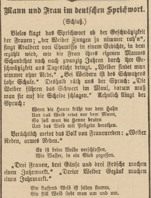 Notre sélection, conclusions et analyses sur la gent féminine sont tirées du journal Elsässer Kurier de 1899. Naturellement : « Toute ressemblance avec des personnes existantes ou ayant existé ne saurait être que pure coïncidence ».