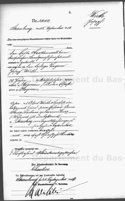 Une femme d'Altkirch a reçu la nouvelle que son mari, engagé dans la légion étrangère, sera fusillé le jour même; Il a été condamné à mort pour tentative d'assassinat sur un gradé. Déjà sous le drapeau prussien, il avait écopé de deux ans de forteresse pour insubordination à un officier. Marié, il a fuit le domicile conjugal et s'est engagé dans la Légion pour cause d'incompatibilité avec son épouse de 30 ans son aînée ainsi que des ennuis divers avec les autorités.