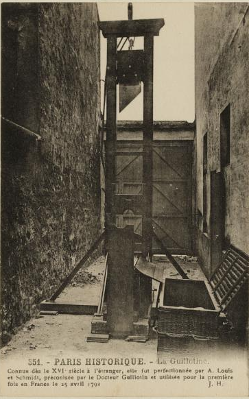 Grâce à un treuil muni d’un câble en acier placé sur la gauche, la partie supérieure en fer est maintenue dans un rail vertical. Ce rail guide une lame inclinée très tranchante, large de trente centimètres, haute d’environ cinquante centimètres et pesant cinquante-cinq kilogrammes. Un levier rigide, situé à l’arrière, permet par une simple pression de déclencher le mécanisme. Aussitôt, la lame fatale tombe avec une force terrible, tranchant net la tête du condamné.
