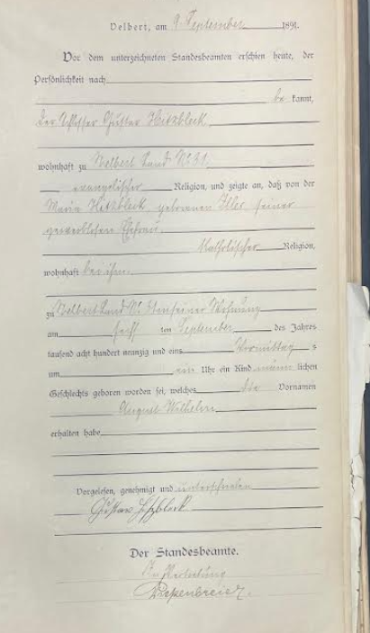 Acte de naissance d'Auguste Wilhelm HITZBLECH en date du 9 septembre 1891