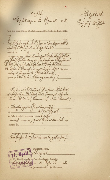 Avec l'aimable concours de la ville de Velbert et de son archiviste, nous connaissons sa date de naissance : le 6 septembre 1891 à 1 heure du matin, au n°31 Welbert Land à Velbert, fils du serrurier Gustave HITZBLECH et de son épouse Maria née ILLER.