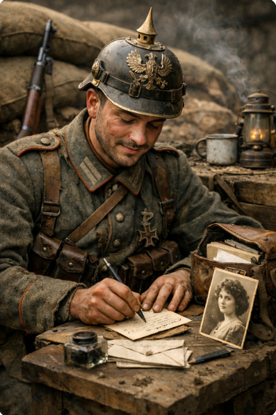 Sa correspondance, écrite simplement, comme écrivent les soldats, est profondément émouvante ; elle jette un jour curieux sur l'entraînement des soldats allemands à la frontière et sur leur degré de résistance. En voici quelques passages.