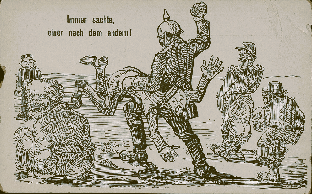 Propagante : Peter (royaume de Serbie) : « Oncle Franz (Autriche-Hongrie), il veut me taper, je n'ai même rien fait » - Oncle Nicolas (Tzar de Russie) : « Ne te laisse pas faire, s'il veux te taper, je t'aiderai ». Derrière Franz'l (casque à pointe, l'Allemagne) et à gauche l'Italie