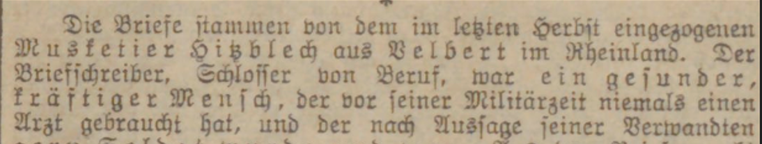 Le journal Hamburger Echo nous apportera des informations cruciales : « Les lettres proviennent du fusilier (Musketier) HITZBLECH, originaire de Velbert en Rhénanie, enrôlé l'automne dernier au régiment de fusiliers n°40. L'auteur des lettres, serrurier de profession, était un homme sain et robuste qui n'avait jamais eu besoin d'un médecin avant son service militaire et qui, selon ses lettres, était devenu soldat avec plaisir. Il ressort également des lettres qu'il était apparemment bien vu par ses supérieurs ; il ne formule d'ailleurs aucun reproche personnel à leur égard concernant les efforts surhumains dont il se plaint ».